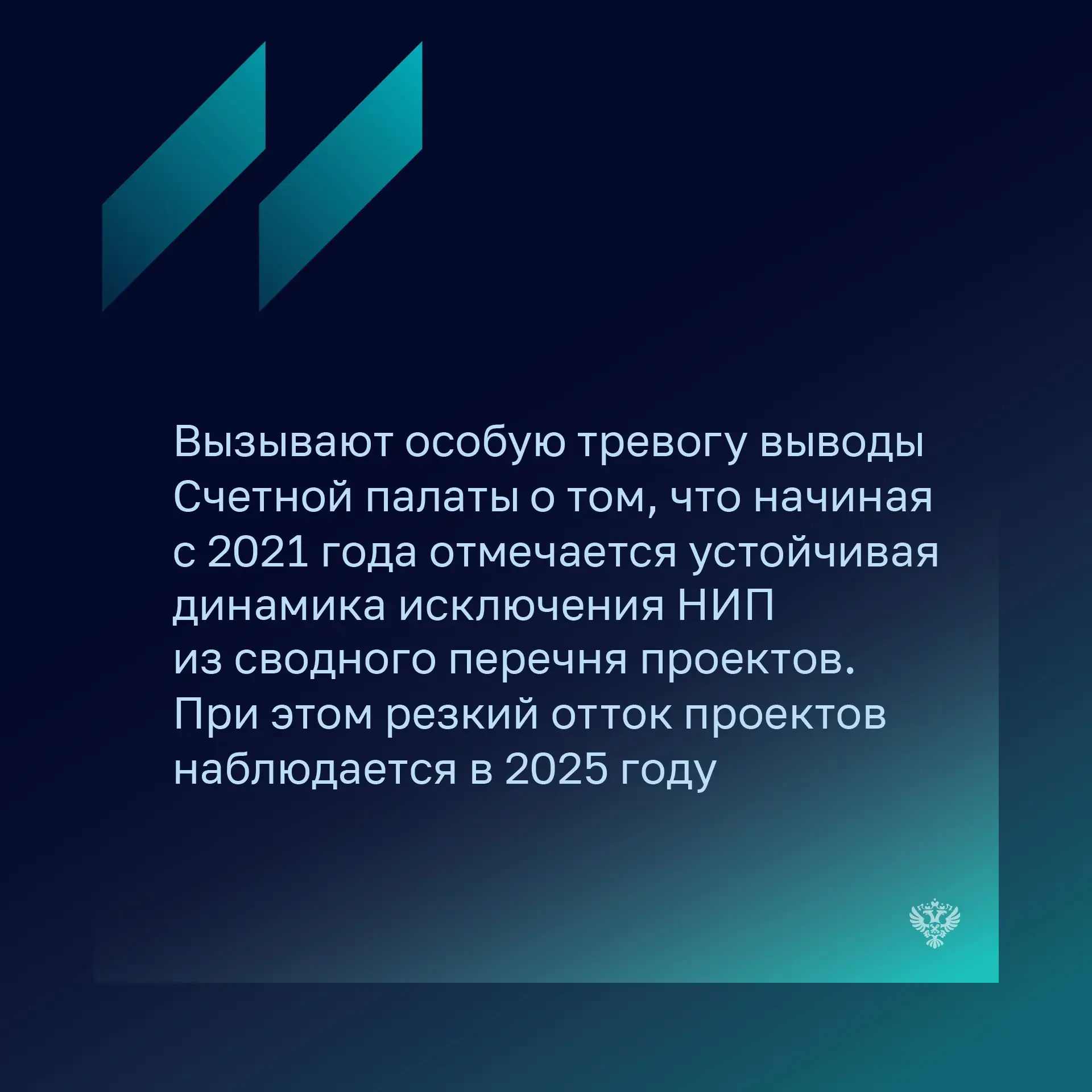 Владимир Гамза, председатель Совета по финансовому рынку и инвестициям, отметил, что проведенный Счетной палатой аудит объективно показал наличие таких значимых проблем при реализации НИП, как: