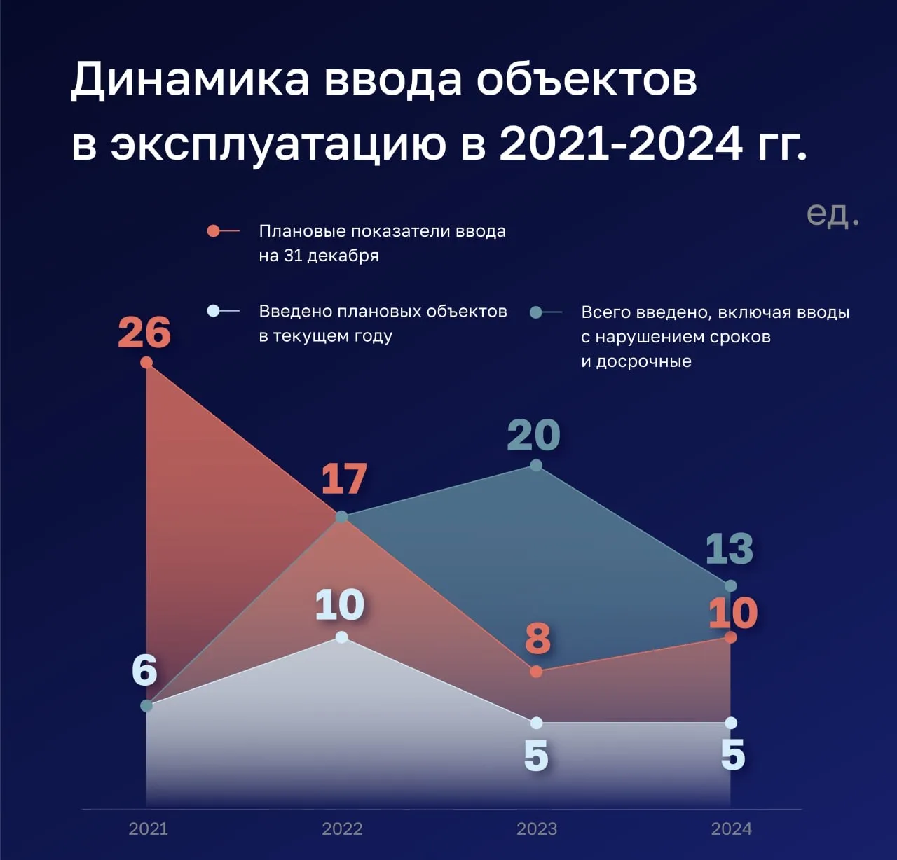 📌 В 2021- 2024 годах из 61 объекта, запланированного к вводу в рамках Реестра объектов капстроительства (на конец отчетного периода), в установленные сроки введено только 26 объектов.