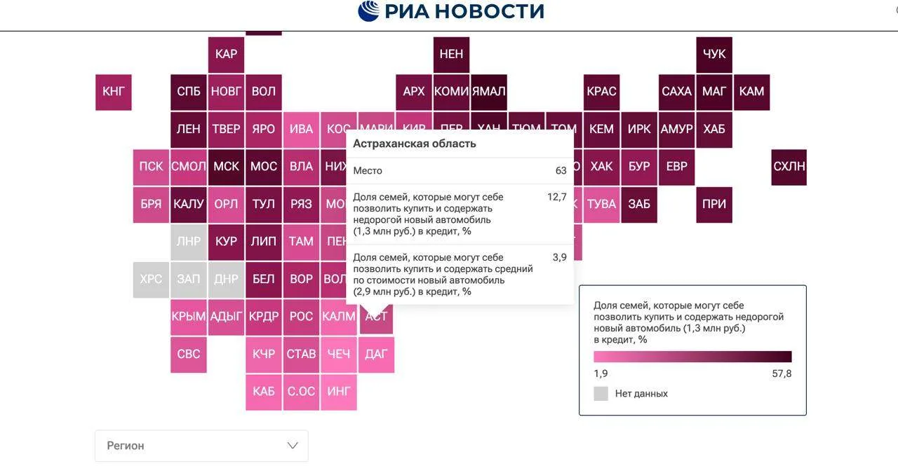 Астраханская область заняла 63 место из 85 по доступности покупки новых автомобилей. По данным РИА Рейтинг, лишь 12,7% семей могут позволить себе кредит на недорогую машину стоимостью около 1,3 млн рублей.