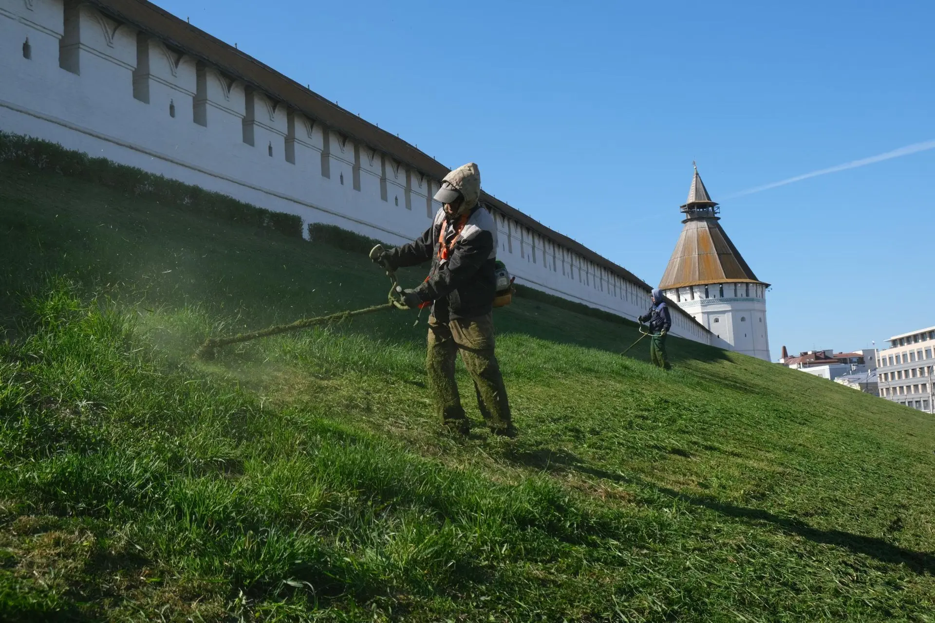 Косят газоны у стен Кремля — работы там уже завершены. На очереди живая изгородь вдоль пешеходной зоны. Параллельно приводят в порядок откосы на Набережной 1 Мая, разделительную полосу на Островского, уже обработали кольцо на Яблочкова и сквер АГУ.