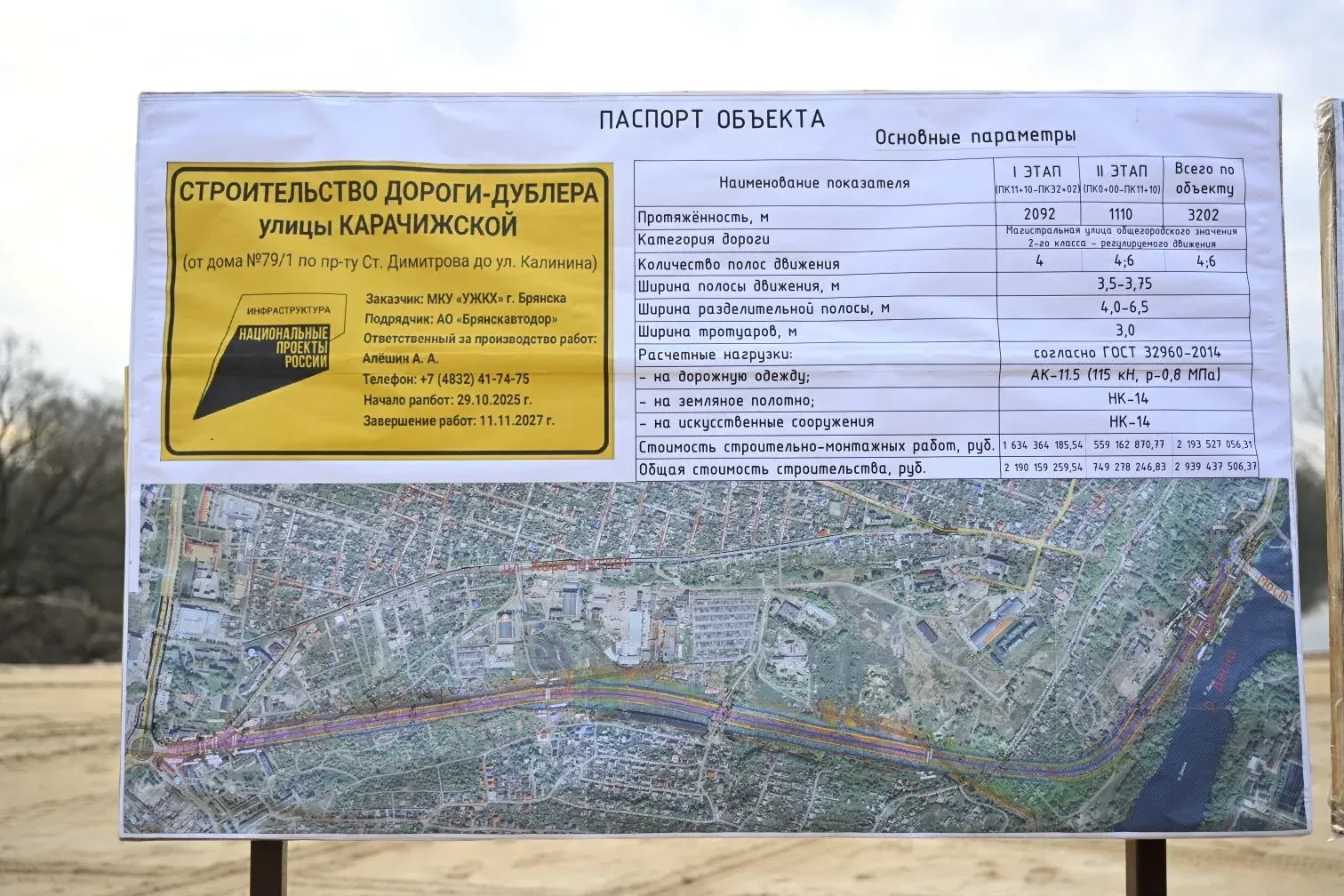 Благодаря поддержке Правительства России, Минстроя, у нас реализуется масштабный проект по строительству дороги-дублера улицы Карачижской. Новая магистраль протяженностью 3,2 км разгрузит центр Брянска, позволит напрямую попадать из Телецентра в Фокинский район.