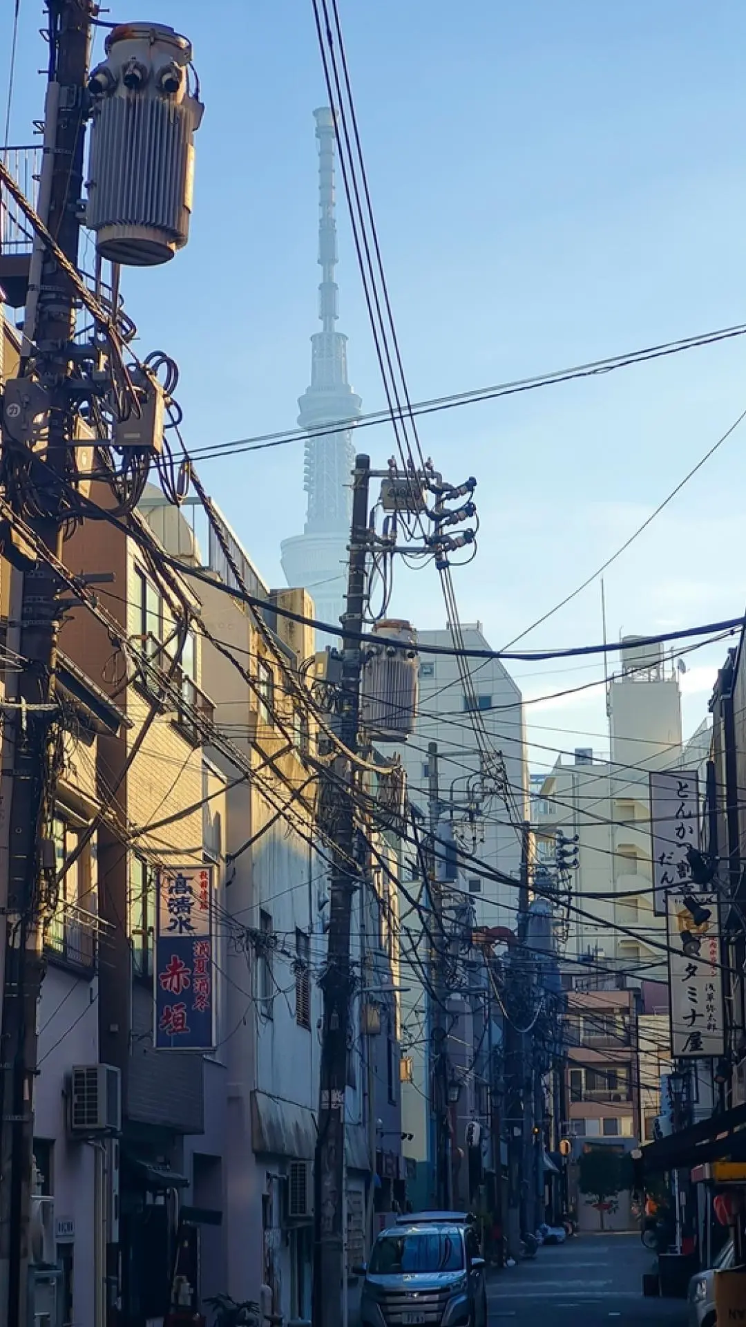 Это квартал Асакуса. Семейные лавки, паутина проводов, тесно припаркованные велосипеды. Особенно это нежно смотрится на контрасте с Токийской телебашней.