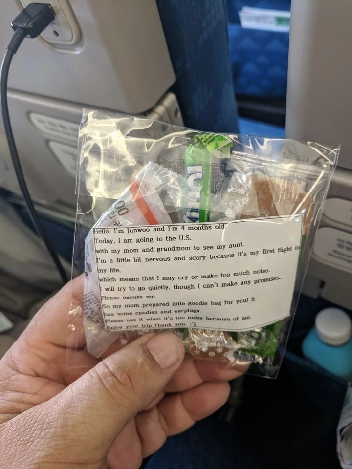 «Привет, меня зовут Джунву и мне 4 месяца. Сегодня я лечу в США со своей мамой и бабушкой, чтобы повидать тётю. Я немножко волнуюсь и нервничаю, потому это мой первый в жизни полёт, поэтому я могу плакать или издавать слишком много шума. Я постараюсь быть потише, но ничего не обещаю. Простите! Мама собрала вам эти гостинцы, здесь конфеты и беруши. Воспользуйтесь ими, когда из-за меня тут станет слишком шумно.