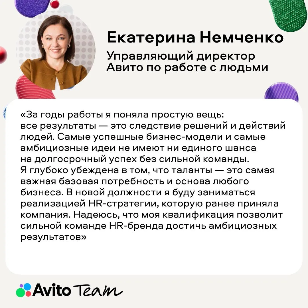 🚀 Екатерина Немченко с 1 октября 2025 года назначена Управляющим директором Авито по работе с людьми (Chief People Officer, CPeO) и войдет в состав правления компании ☝🏻