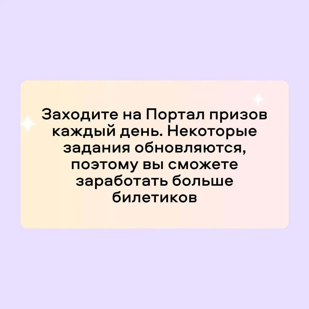 В карточках рассказываем, какое количество билетиков нужно, чтобы претендовать на разные призы, и делимся секретами, как накопить больше билетиков ✨