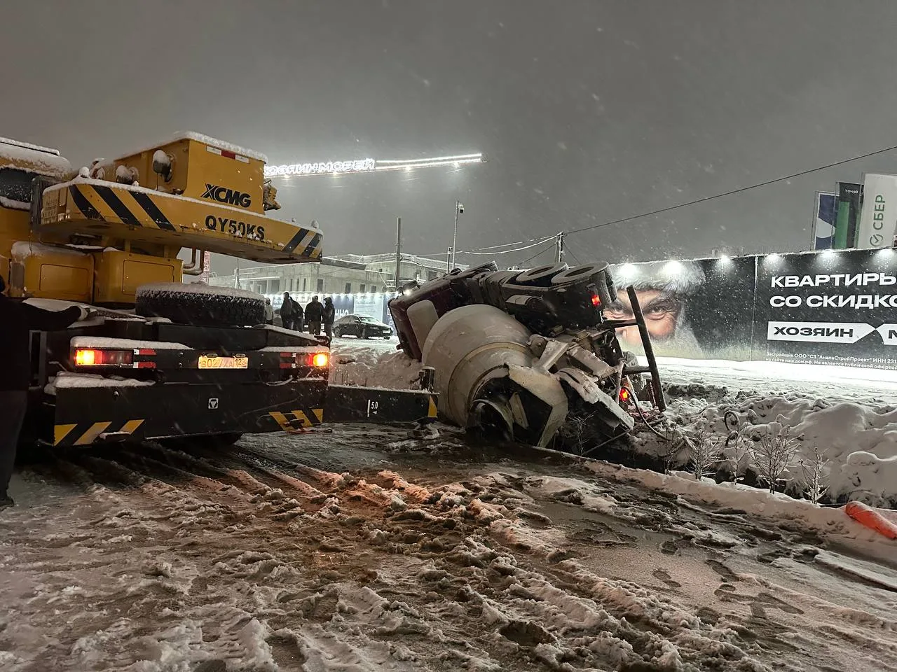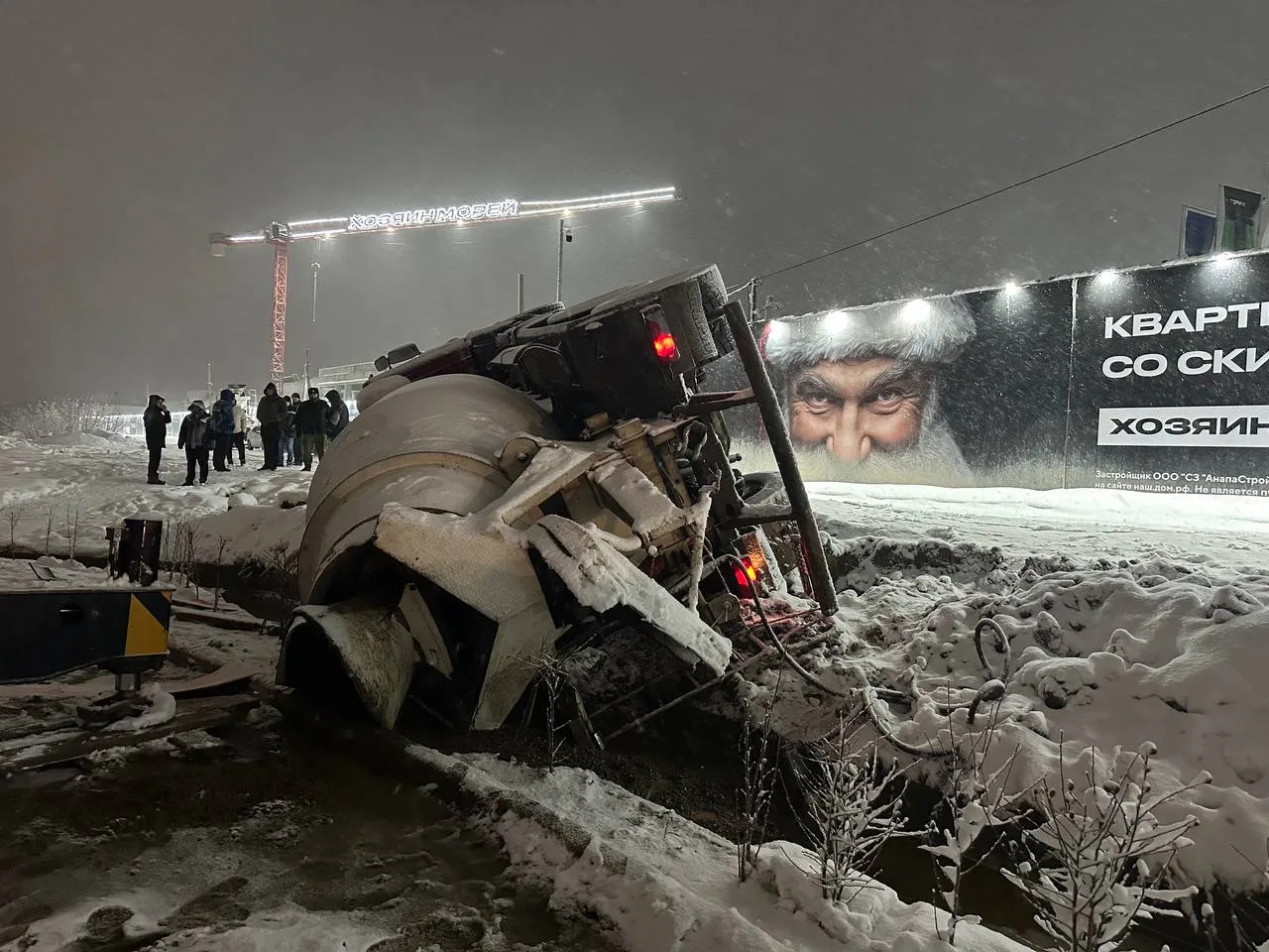 В Анапе на пересечения улиц Ленина и Аэродромная во время маневра задним ходом водитель бетономешалки не справился с управлением на склоне, в результате чего машина опрокинулась.