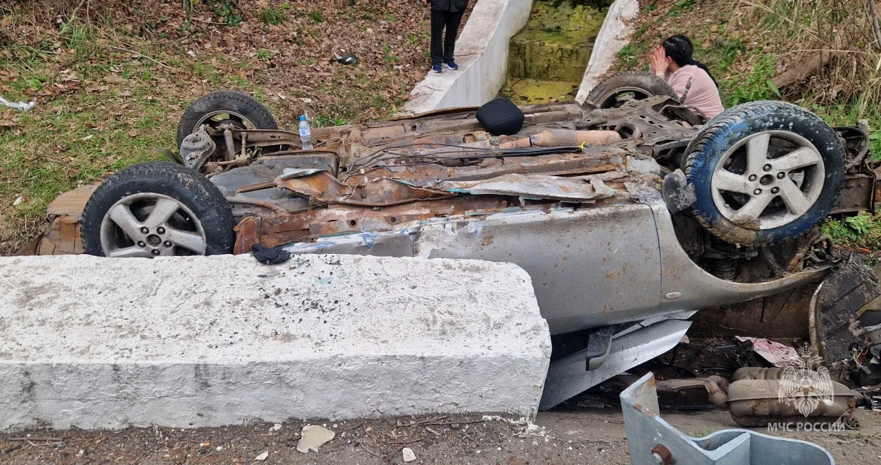 Mazda рухнула крышей вниз в ливневку в Сочи, водитель оказался заперт до приезда спасателей.
