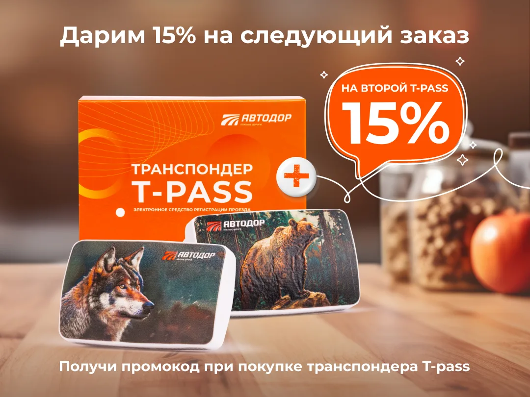 До 31 декабря приобретая транспондер T-pass по полной стоимости, вы автоматически получаете промокод на скидку 15% для следующей покупки.