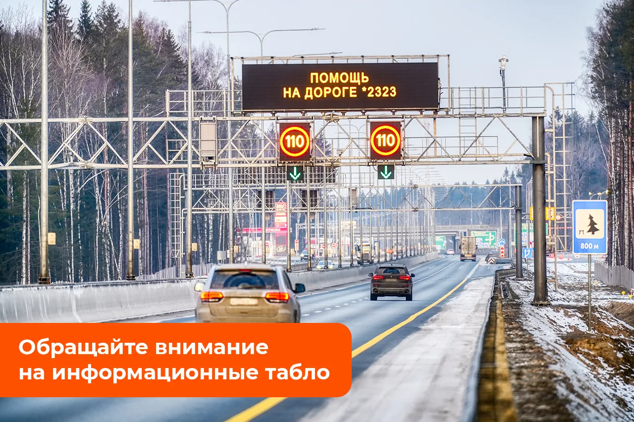 Избегайте резких маневров, соблюдайте безопасную дистанцию и выбирайте скорость, исходя из обстановки на дороге. И обязательно следите за информацией на интерактивных табло над трассой. Там мы заранее сообщаем обо всех ограничениях и изменениях движения.