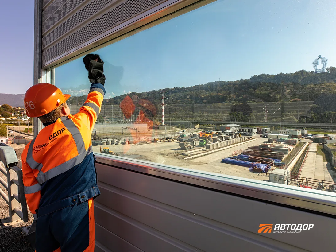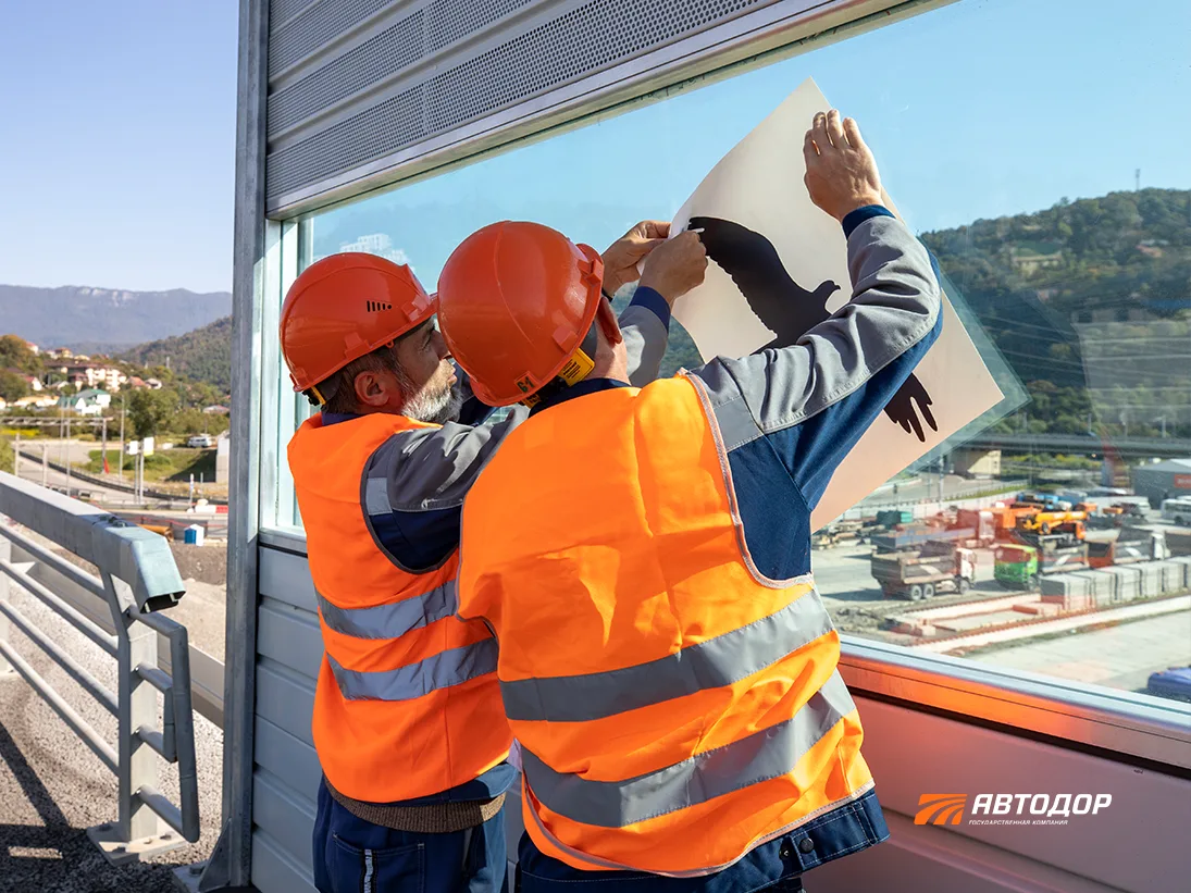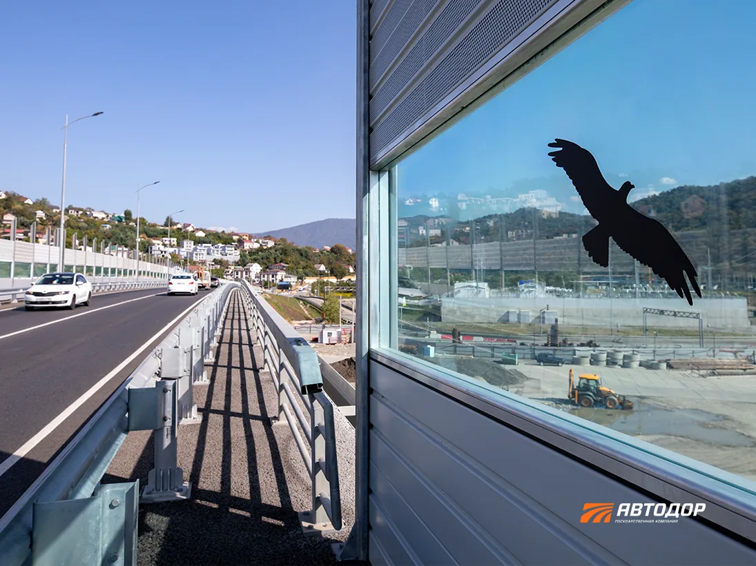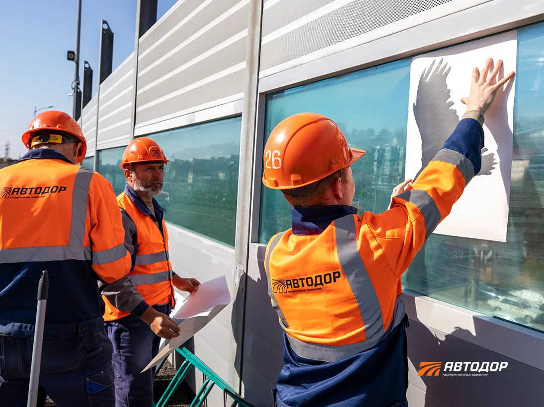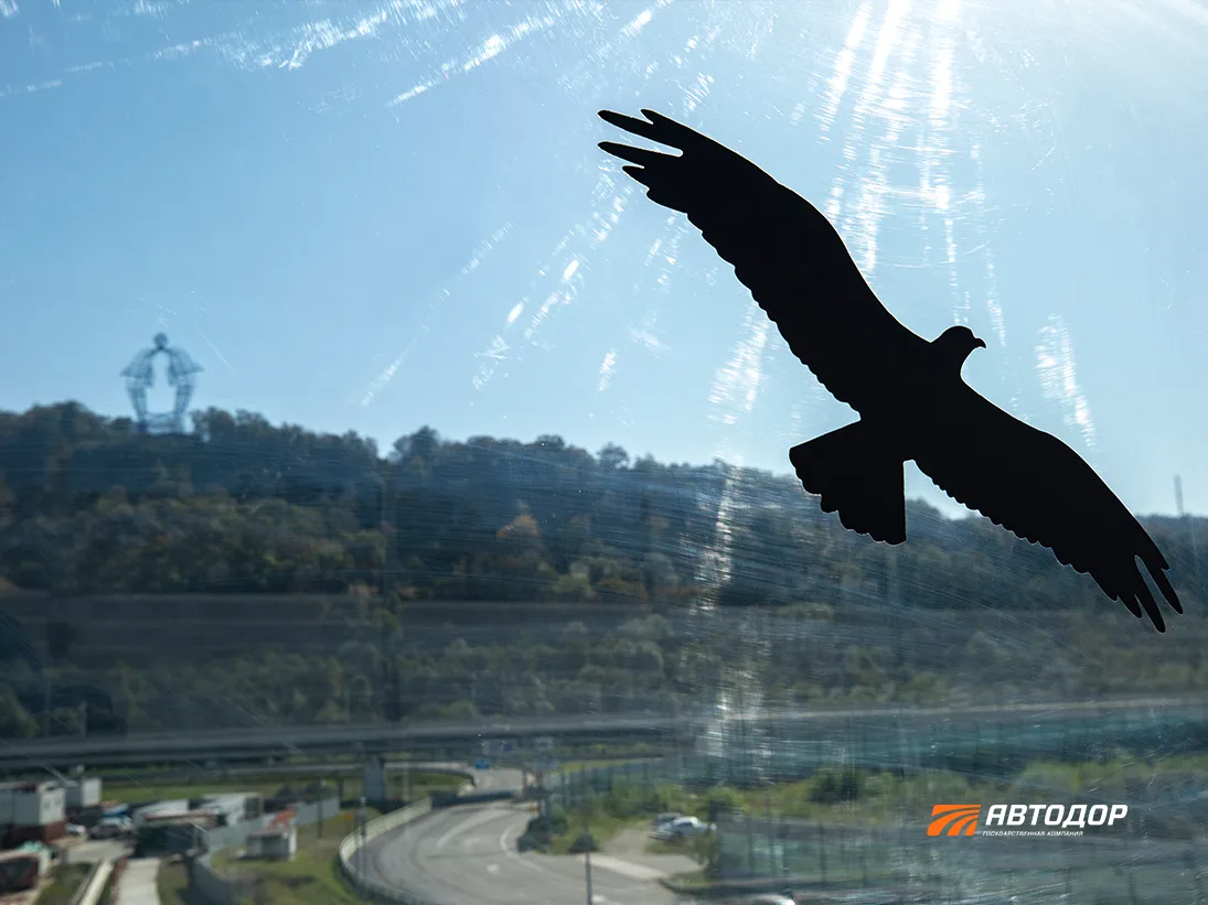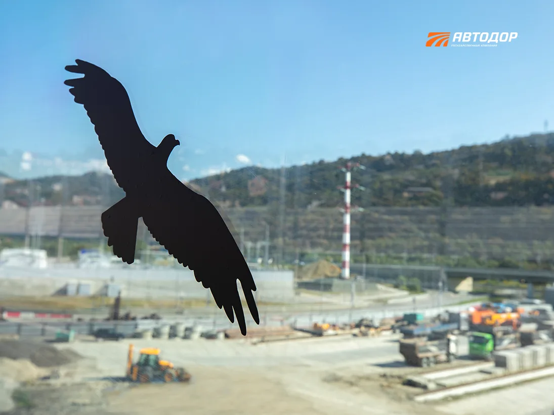🦅 На шумозащитных экранах вдоль Ивановской эстакады у восточного портала обхода Адлера разместили наклейки с силуэтами хищных птиц. Это проверенный способ отпугивать птиц поменьше, которые не замечают стекла и рискуют разбиться об них.
