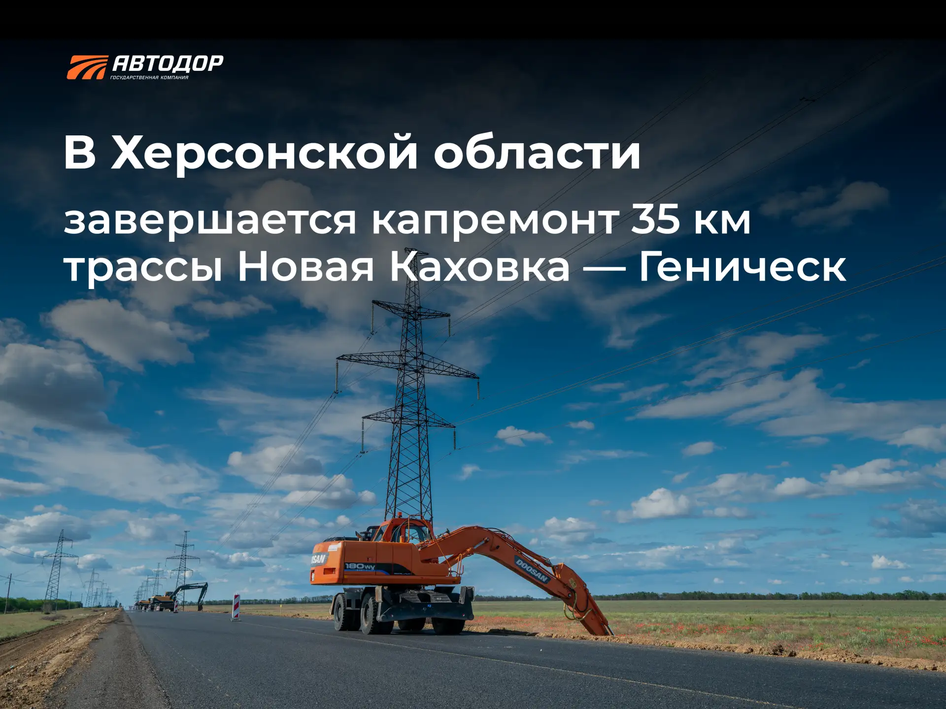 В Херсонской области силами Госкомпании «Автодор» завершается капитальный ремонт участка автомобильной дороги Новая Каховка – Геническ протяженностью более 35 км. Работы ведутся от населенного пункта Софиевка до пересечения с трассой Одесса – Мелитополь – Новоазовск.