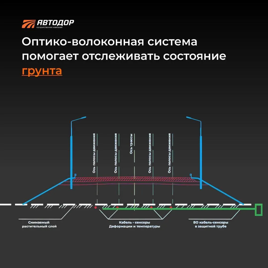 🛣 Сенсоры, уложенные под основанием земляного полотна, фиксируют малейшие деформации и изменения температуры грунта. Информация автоматически передается на местный пункт мониторинга и в центральный пункт управления Государственной компании «Автодор».