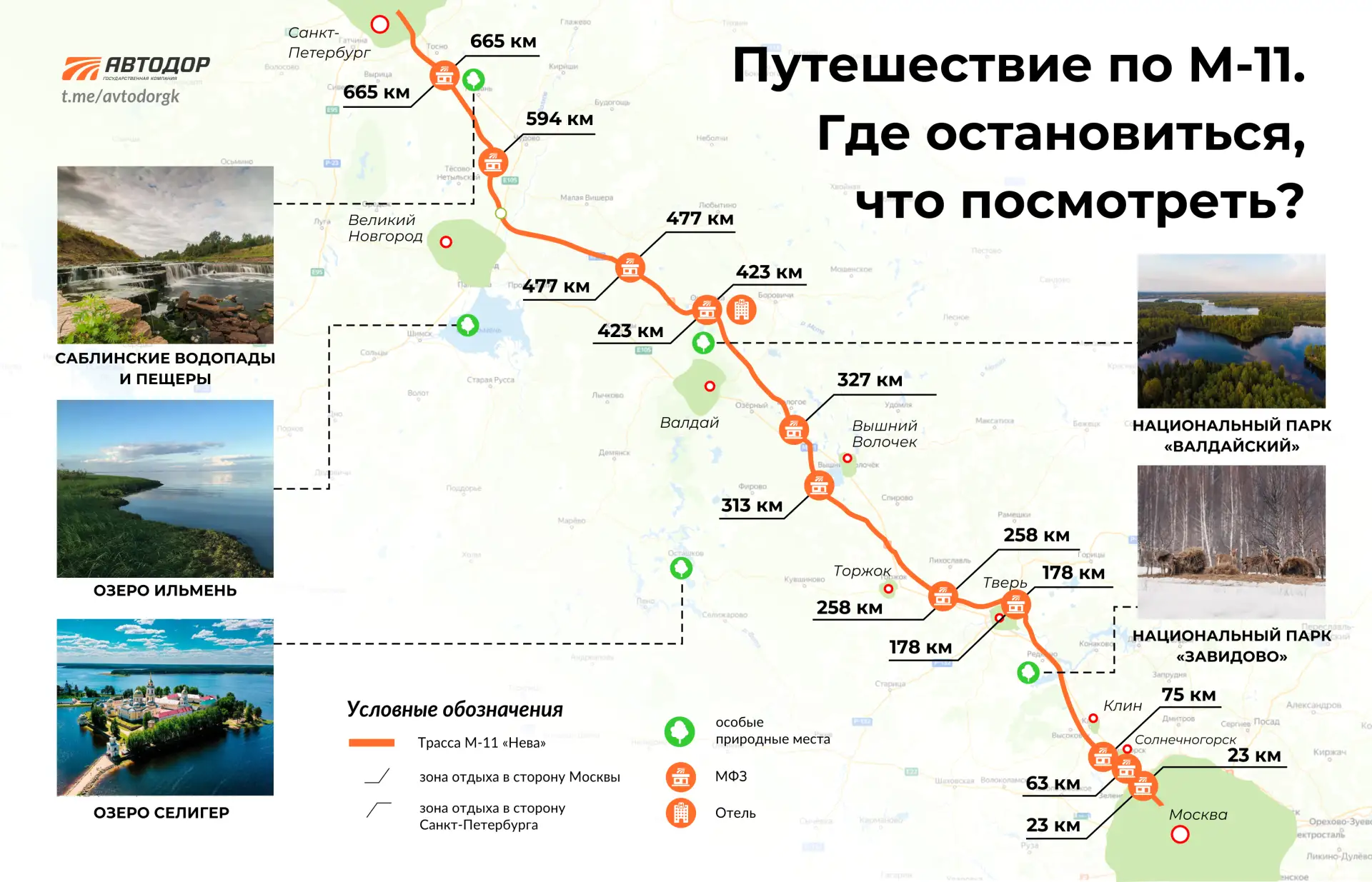 🗺️ Мы собрали на карте живописные места, до которых легко добраться по М-11: озера, национальные парки, заповедники и уютные туристические маршруты.