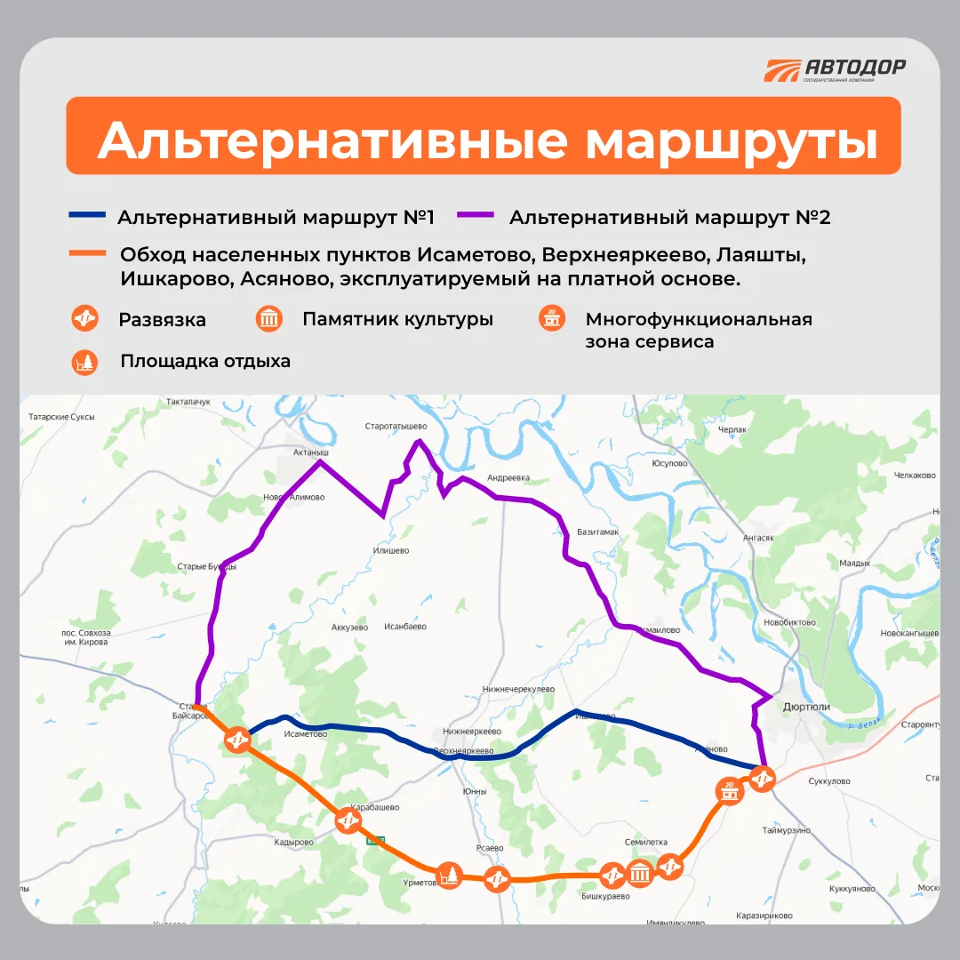 ⚠️ Объезд по региональной дороге, съезд через развязку на 395 км М-12 в направлении Казани.