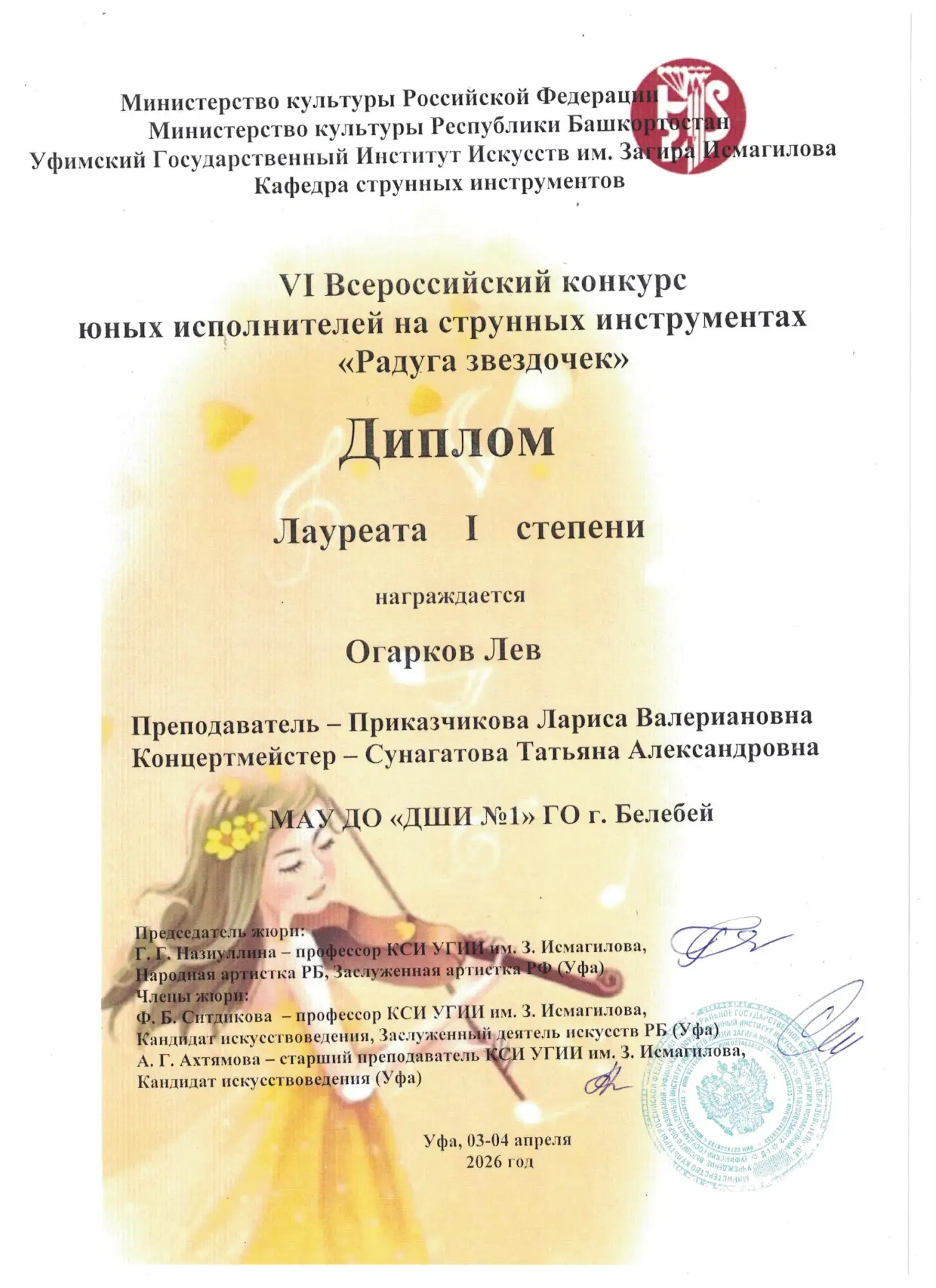 В Уфе прошёл VI Всероссийский конкурс юных исполнителей на струнных инструментах «Радуга Звёздочек». Белебеевский район достойно представил ученик Детской школы искусств № 1 Лев Огарков.