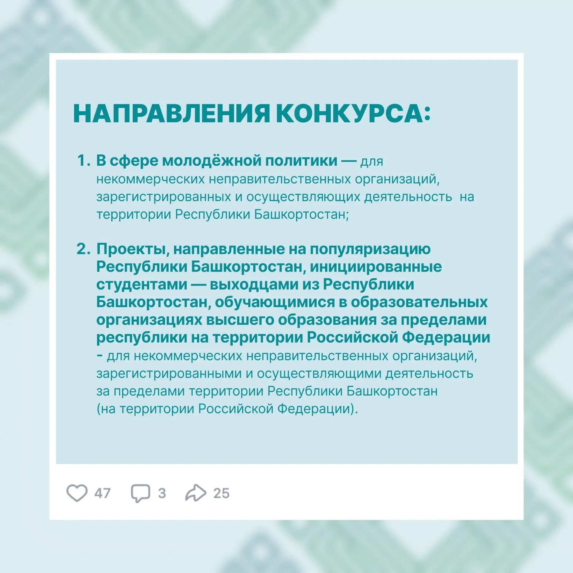 ☝ По поручению Радия Хабирова в конкурсе выделили направление для студентов – выходцев из Башкортостана. Оно предназначено для тех, кто учится в вузах за пределами республики и хочет реализовать социальный проект, популяризирующий родной регион.