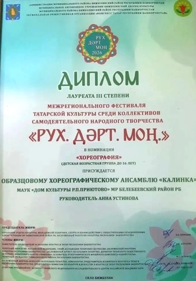 Белебеевский район на конкурсе в номинации «Хореография» представил образцовый хореографический ансамбль «Калинка» под руководством Анны Устиновой, который был удостоен Диплома Лауреата III степени. 👏🏻