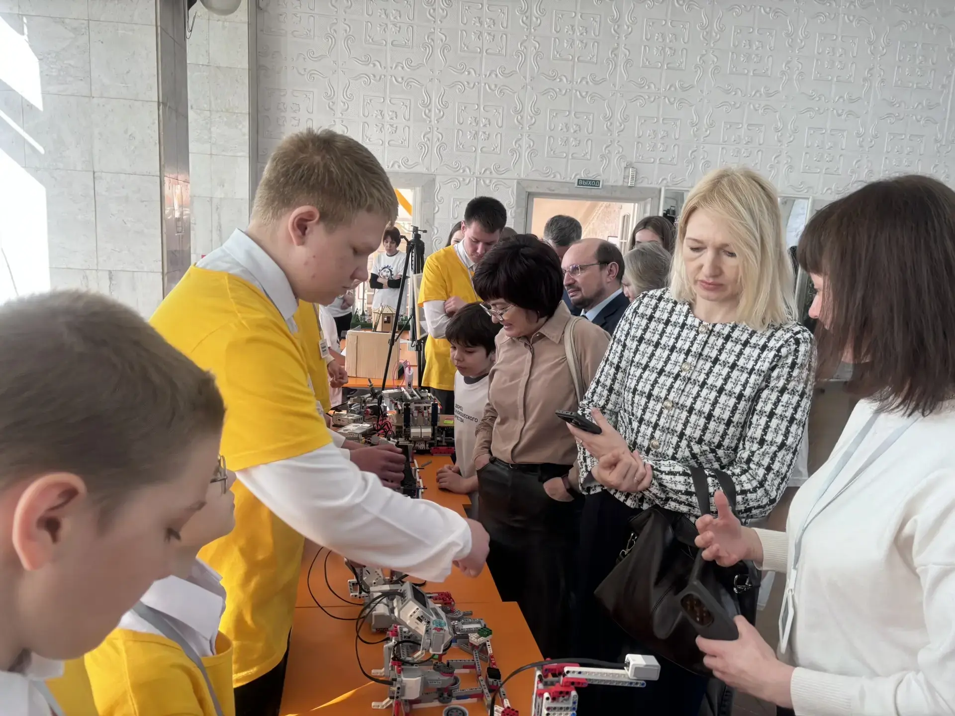 Взрослые проходят полную процедуру ЕГЭ: регистрация, сдача телефонов и личных вещей, предэкзаменационный контроль, заполнение бланков. Всё - как на настоящем экзамене.