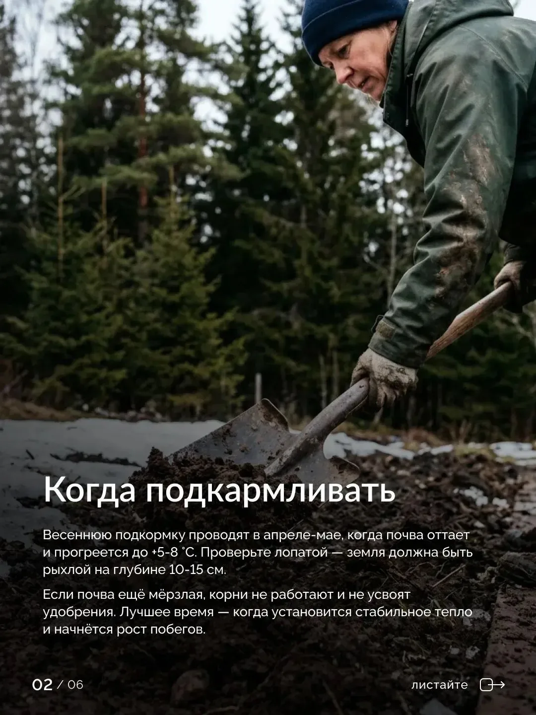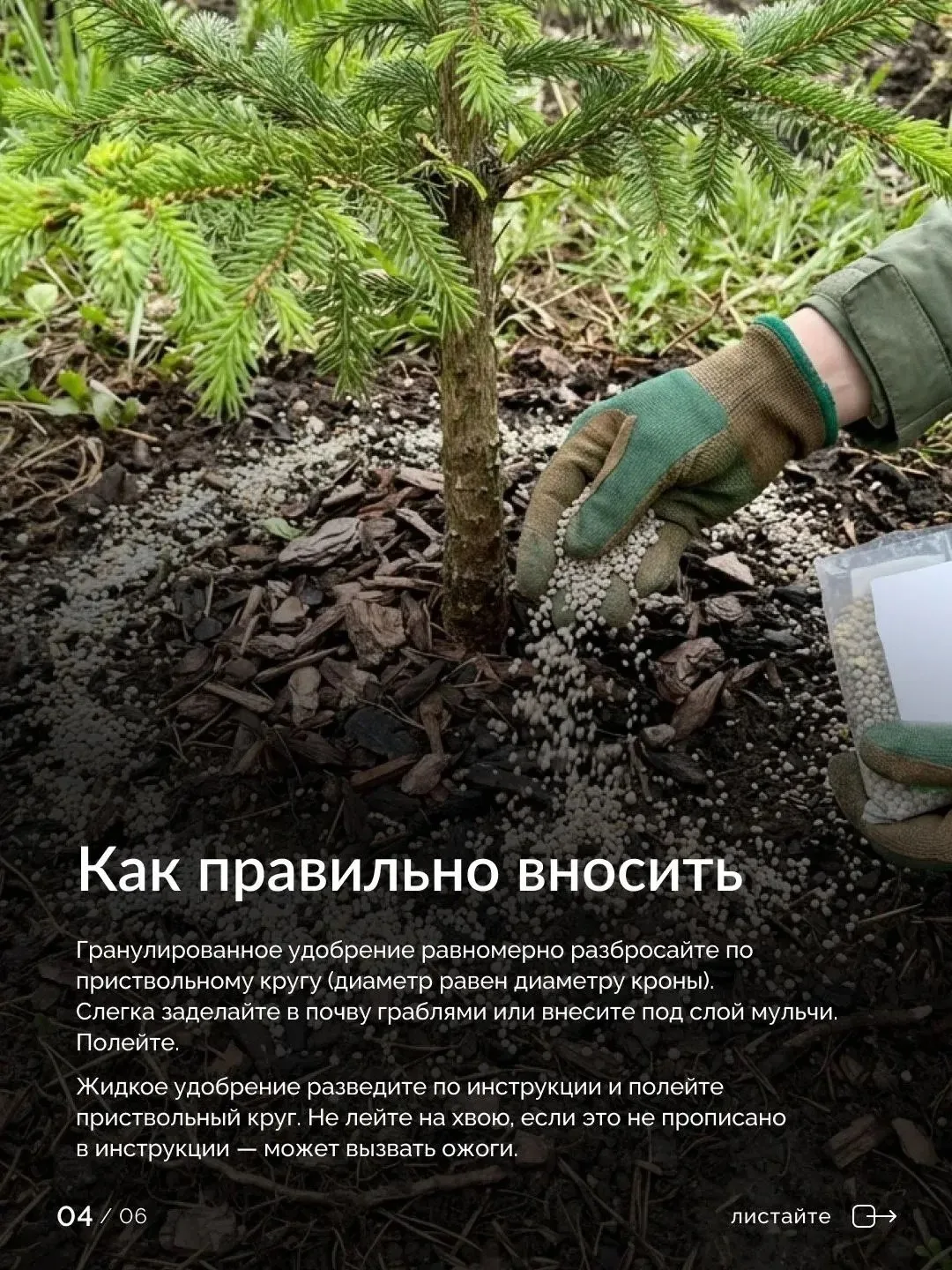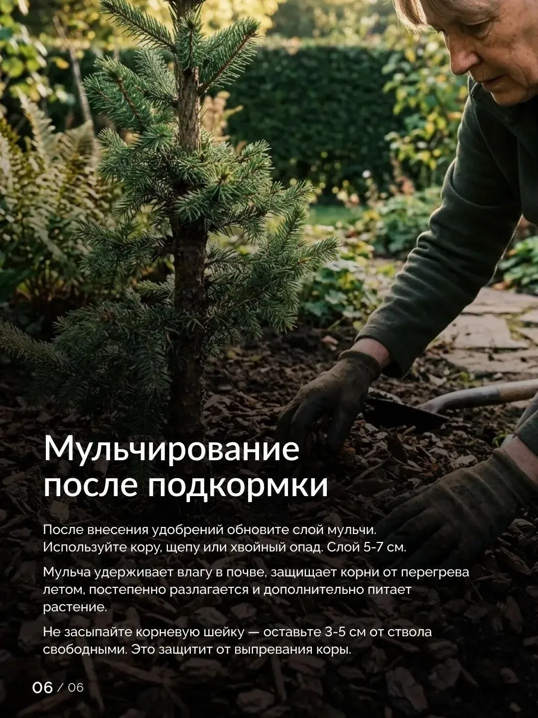 Когда почва прогреется, обязательно засыпьте приствольный круг слоем до 15 см (если мульчи ещё нет). Идеально: сосновый опад, кора, щепа, хвойные опилки. Они сохраняют влагу, глушат сорняки и продолжают естественным образом подкислять грунт 🌲