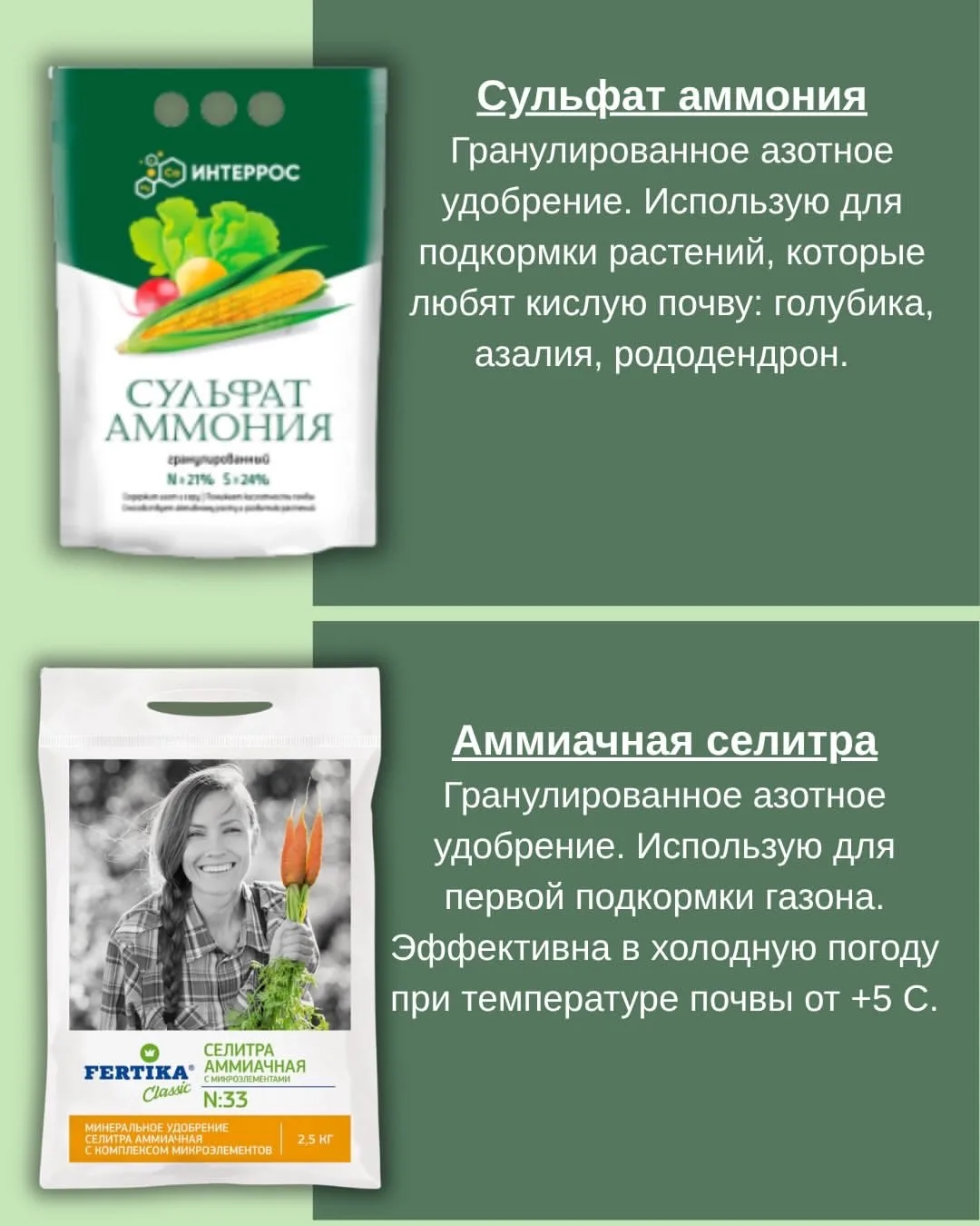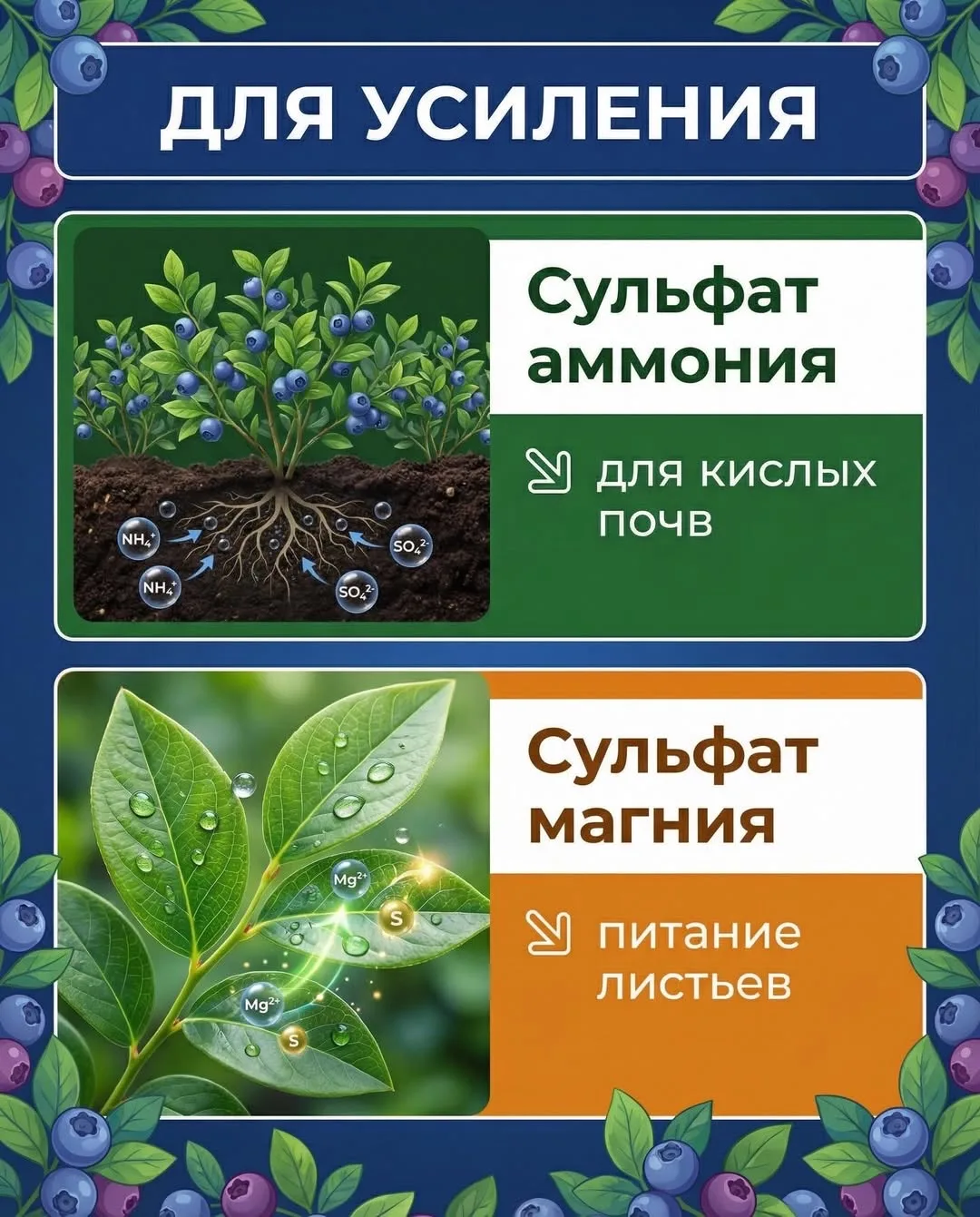 ✔ Сульфат аммония — для кислых почв (гортензии, голубика)