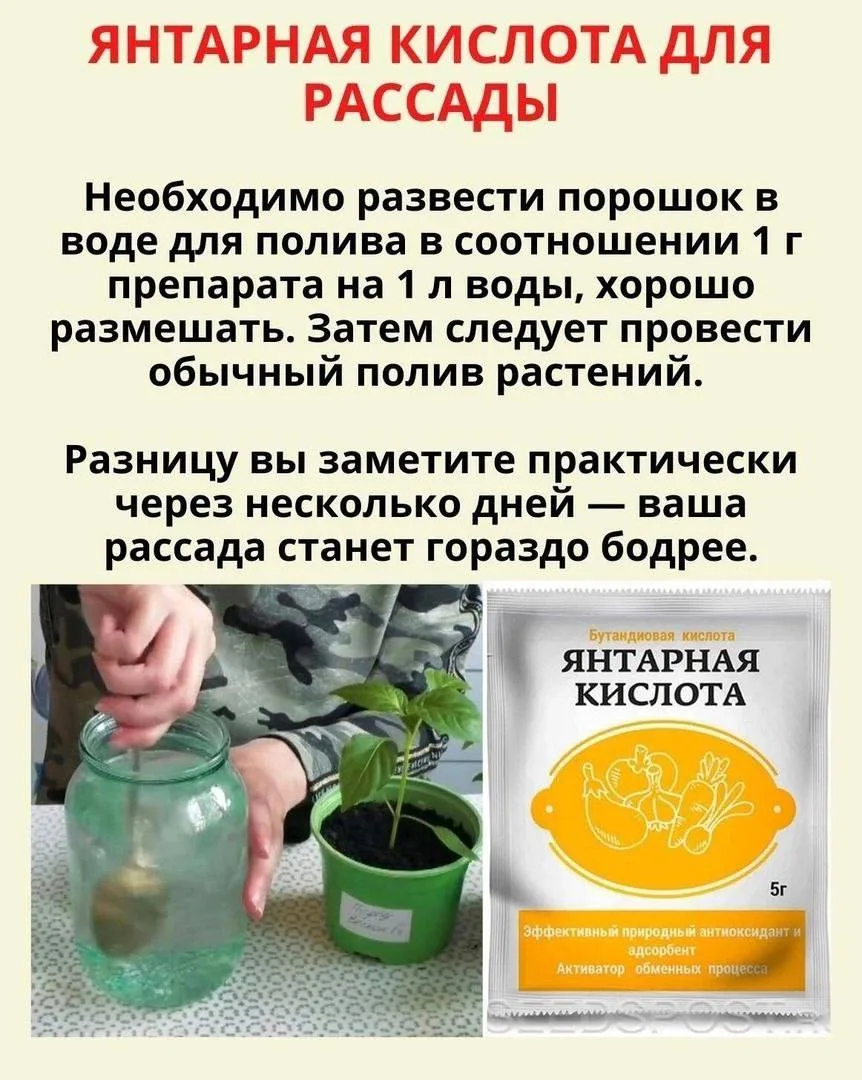 Янтарная кислота — отличный природный стимулятор, который помогает семенам дружно прорастать и укрепляет будущие растения. Она не заменяет удобрения, но улучшает усвоение питательных веществ и активизирует ростовые процессы.