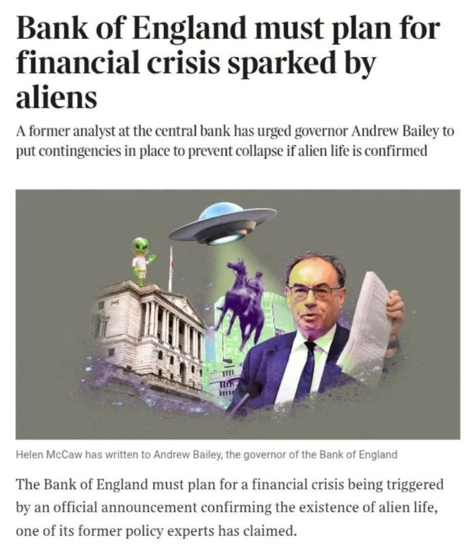 Банк Англии должен готовиться к возможному финансовому кризису из-за подтверждения существования инопланетян.