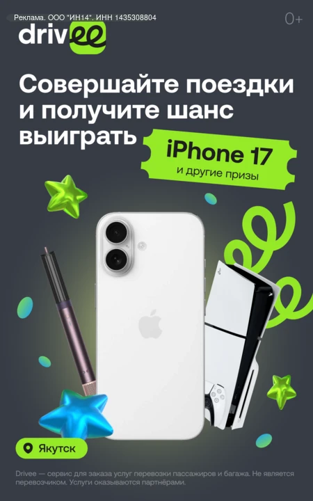 Чаще катайтесь с Drivee по Якутску и получите шанс выиграть iPhone 17, PlayStation 5, стайлер Dyson и другие призы 🔥