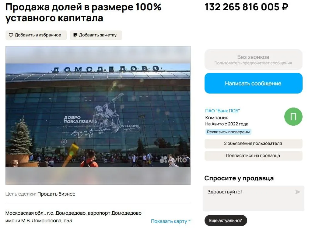 На Авито продается 100% долей аэропорта Домодедово за 132,26 млрд рублей, продавец — официальный аккаунт ПАО "Банк ПСБ".