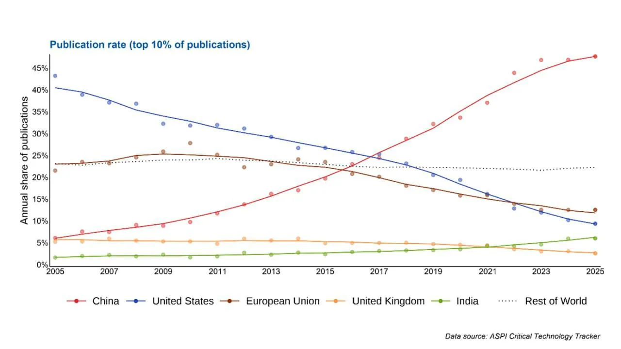 Согласно трекеру критических технологий ASPI на 2025 год, Пекин возглавляет 66 из 74 ключевых направлений, тогда как США — только в 8.