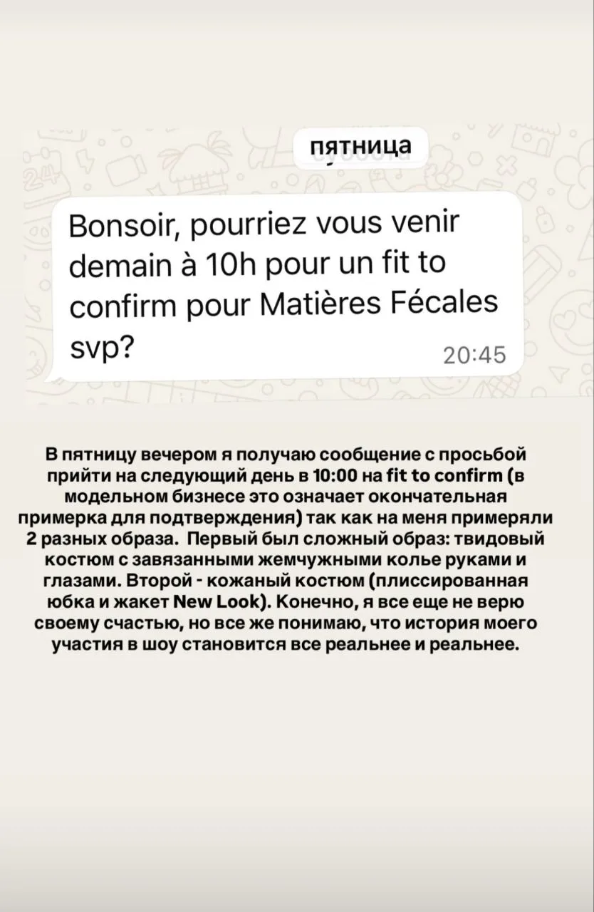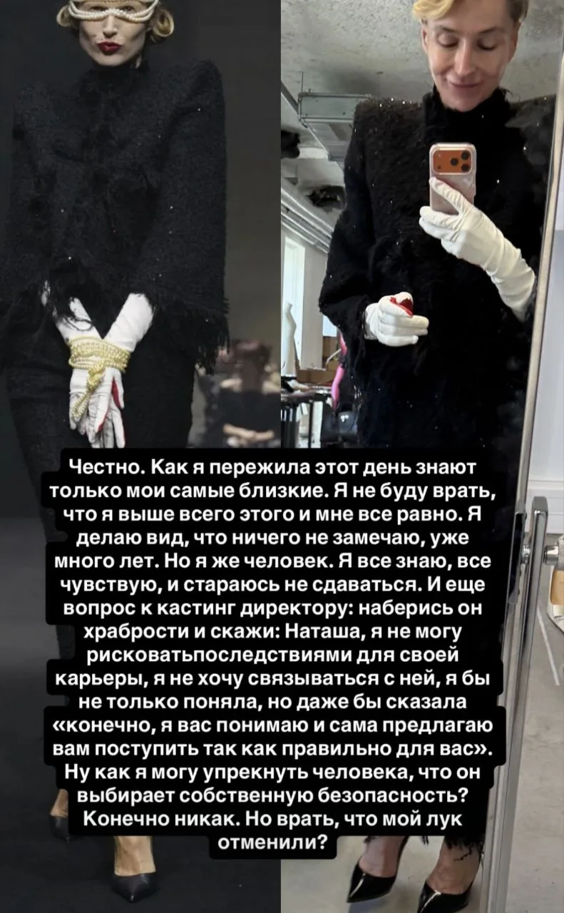 Наташа утвердили на показ, заставили бегать по местным собесам, собирать справки для участия в эпохальном мероприятии, но в день икс сообщили: "До свидания, уважаемая! Вашего лука на подиуме не будет".