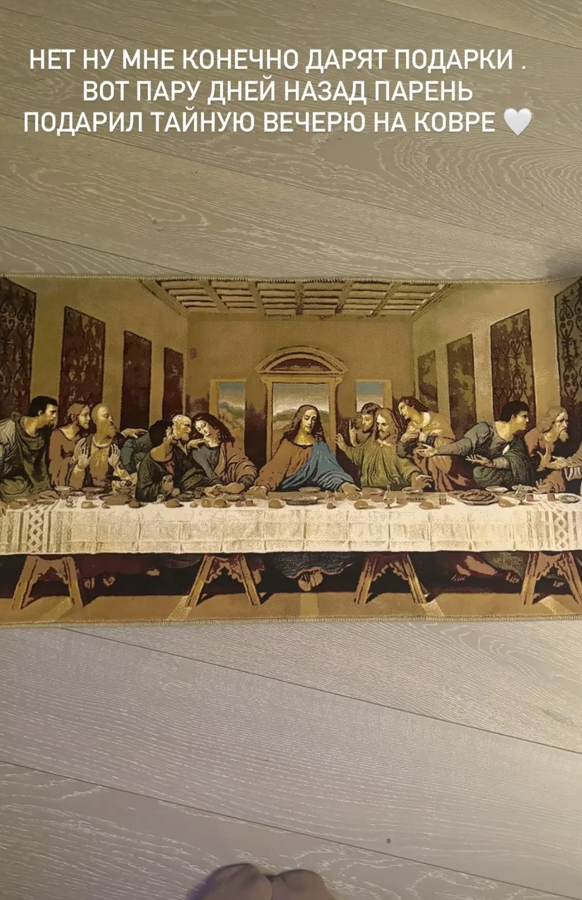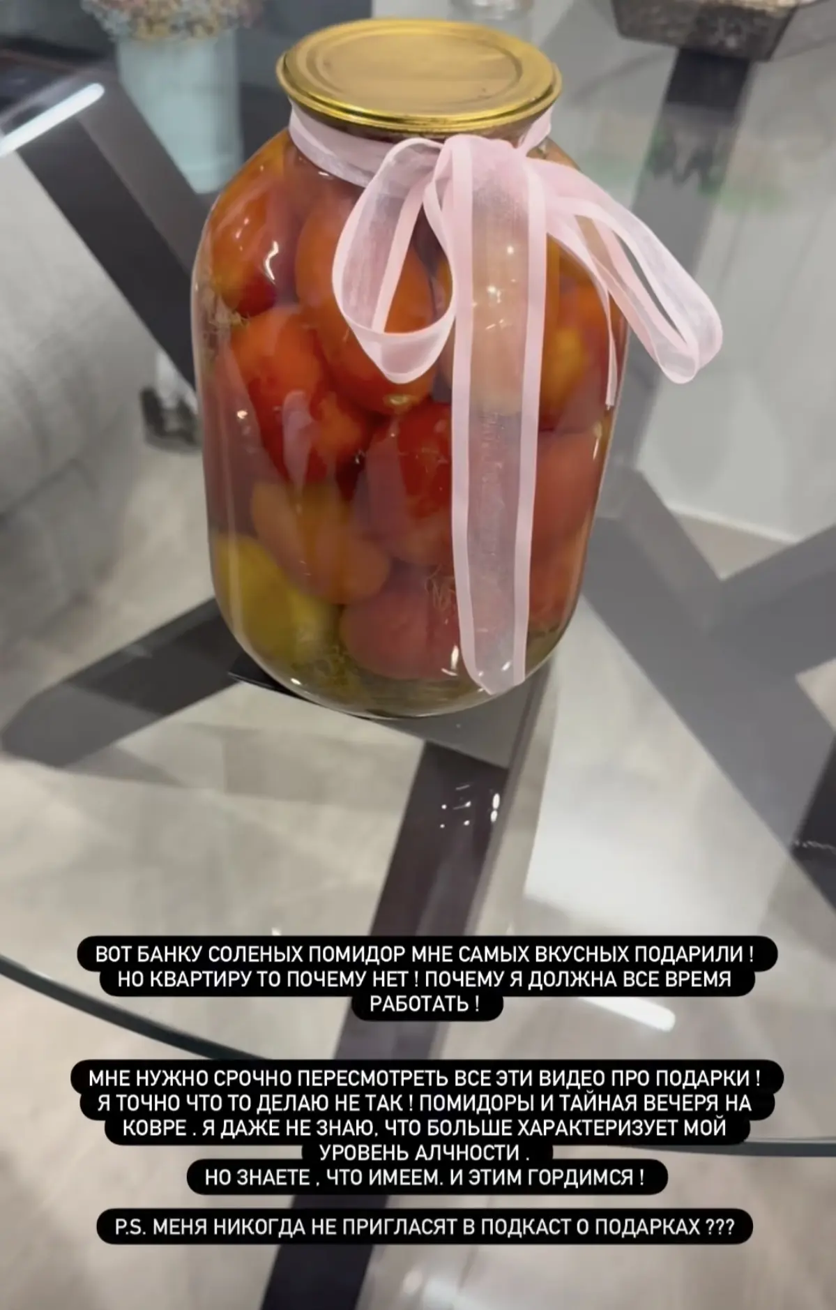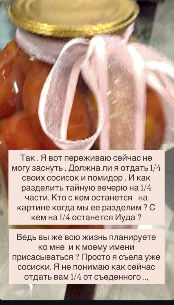 Если уж собрались делить ее подарки, то, пожалуйста: вот вам коврик, банка помидор и коробка сосисок, которую заботливый поклонник ей вручил.