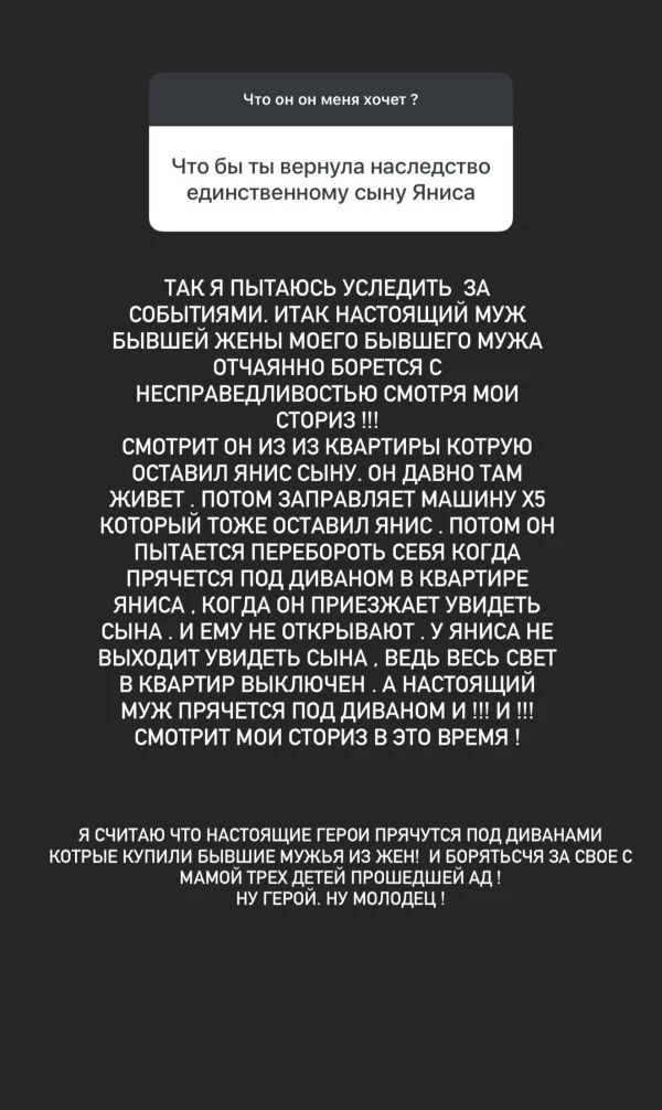 Попутно Анна дала понять, что бывшая жена Яниса, устроившая всё это, как раз-таки живёт со своим нынешним муженьком в купленной и обставленной за счёт Яниса квартире, катается на приобретенной покойным хорошей машине, а ее нынешний муж регулярно смотрит истории самой Аннушки, не пропуская ни одну уже много лет.