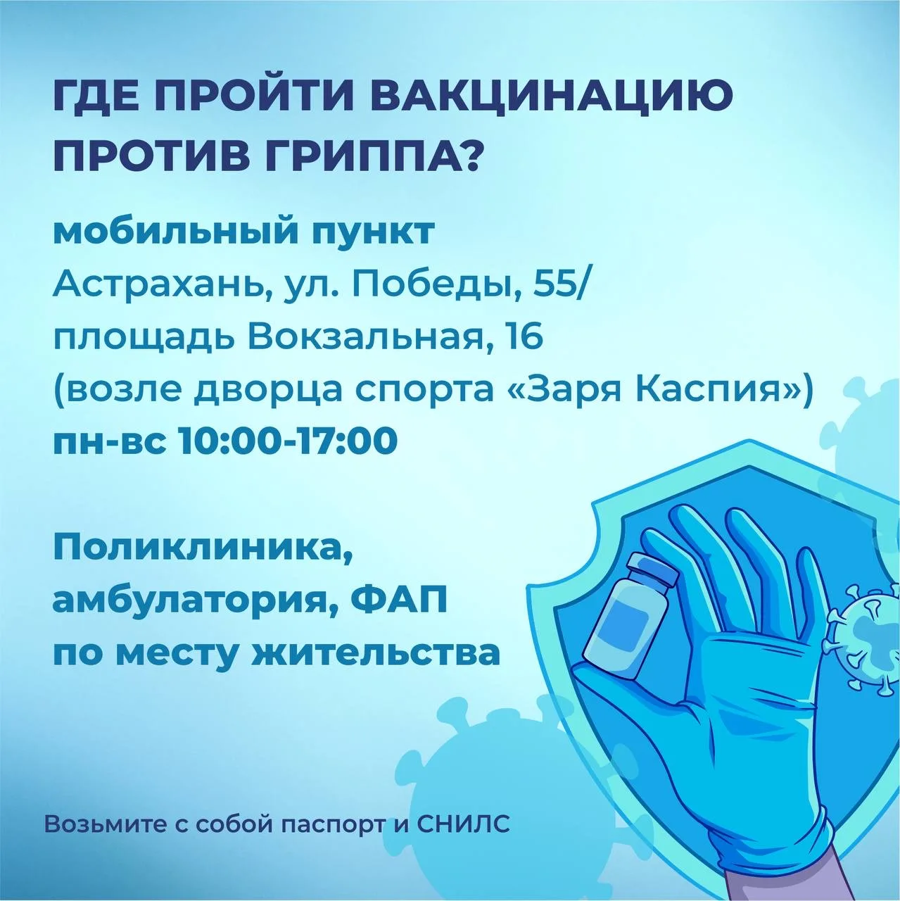 В областном центре пройти вакцинацию, а заодно и флюорографию бесплатно можно в мобильном комплексе возле Дворца спорта «Заря Каспия» на улице Победы, 55. Работает он ежедневно с 10:00 до 17:00. С собой нужно взять только паспорт и СНИЛС. Кроме того, прививки доступны во всех поликлиниках, амбулаториях и ФАПах региона.