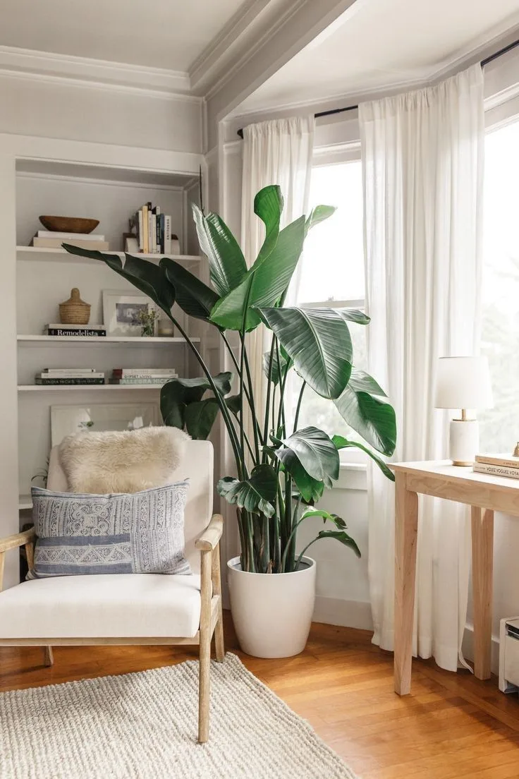 Даже одно крупное растение меняет ощущение пространства. Зелёный цвет автоматически делает комнату живой и дышащей.