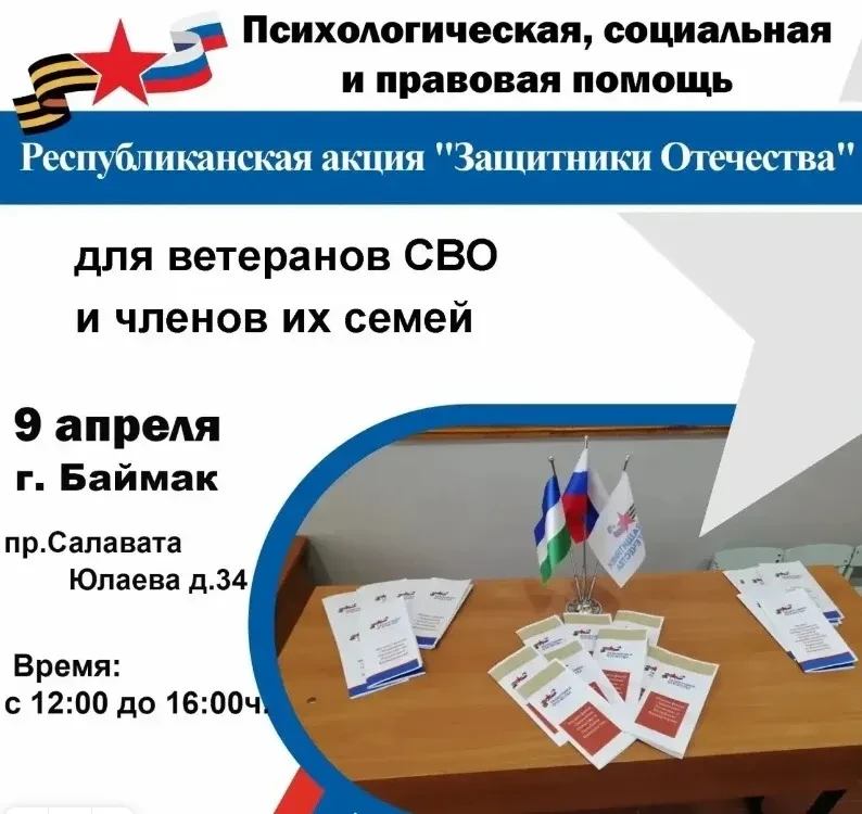 В Районном доме культуры пройдёт республиканская акция "Защитники Отечества" для участников специальной военной операции и членов их семей. В рамках акции им окажут правовую, психологическую и социальную помощь.