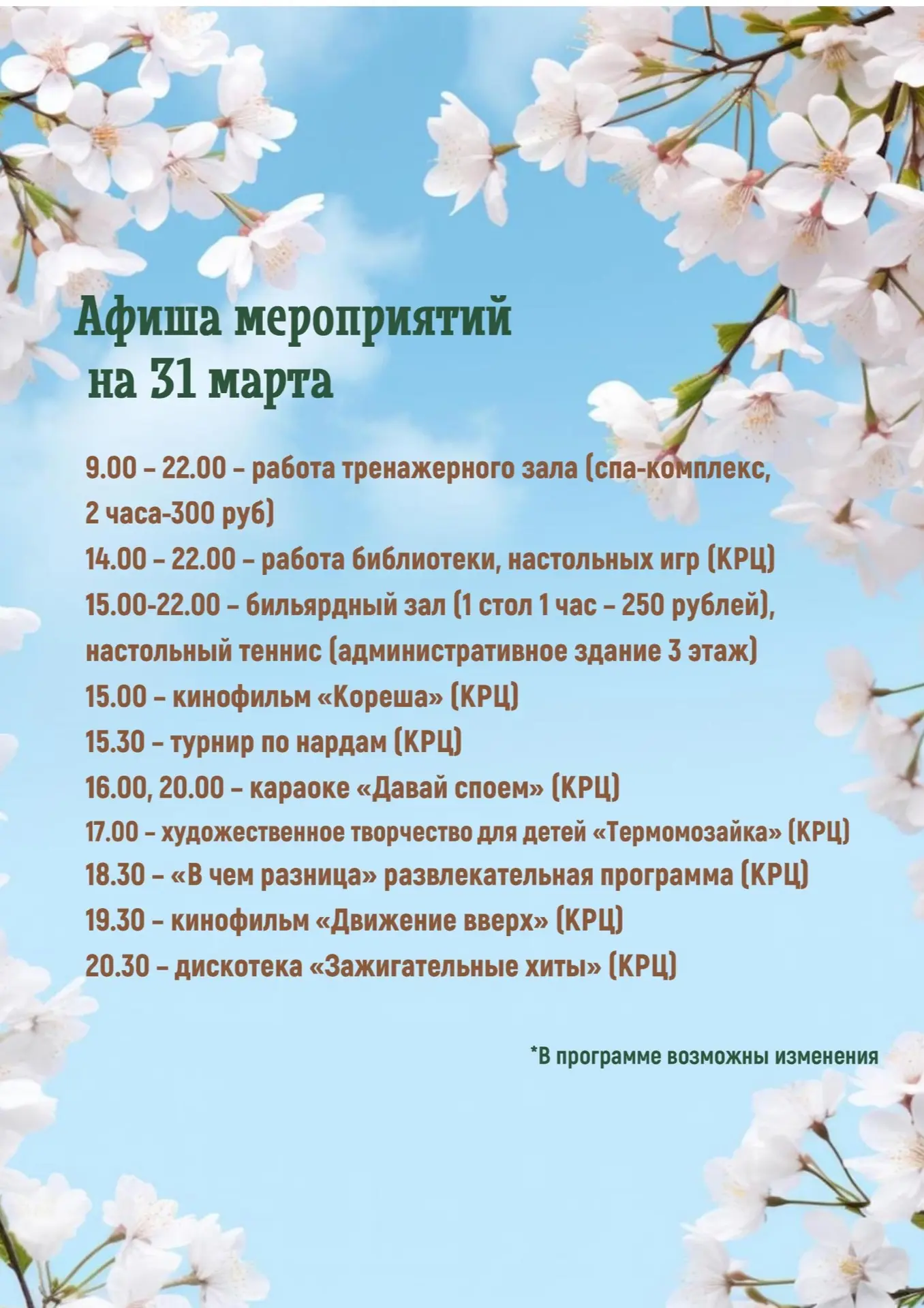 💦 Развлечения и досуг для всех возрастов. Творческие мастер‑классы, семейные кинопоказы и тематические вечера, дискотеки и караоке, викторины и турниры, настольные игры, библиотека.