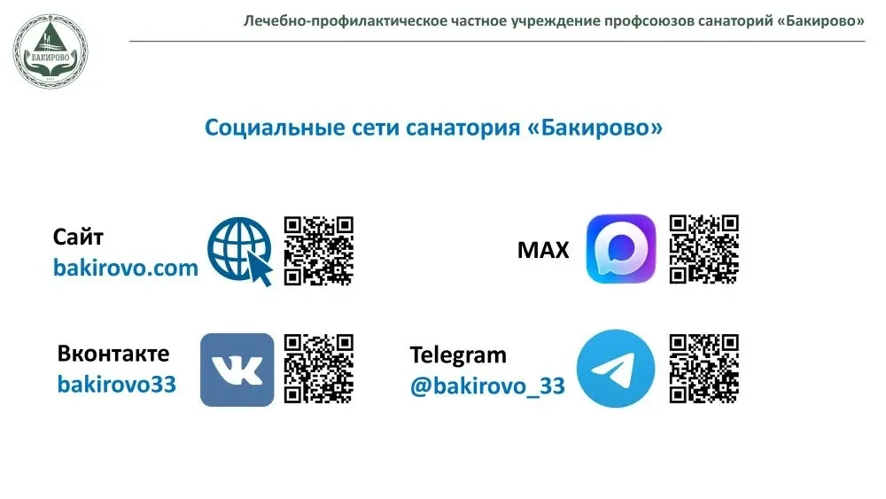 Друзья, мы продолжаем информировать вас о самых актуальных новостях санатория "Бакирово" и делимся ссылками на наши странички в социальных сетях, чтобы всегда оставаться с вами на связи.