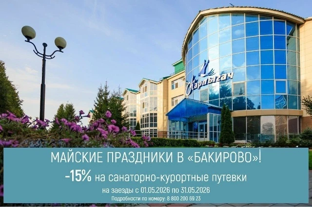 🌈Май — идеальное время для отдыха и оздоровления: природа пробуждается, воздух наполняется свежестью, а первые тёплые дни дарят заряд энергии на весь год. Подарите себе и близким незабываемый майский отдых в санатории «Бакирово» — и сэкономьте! Только до 30 апреля забронируйте санаторно‑курортную путёвку на май 2026 года и получите выгоду 15 %.