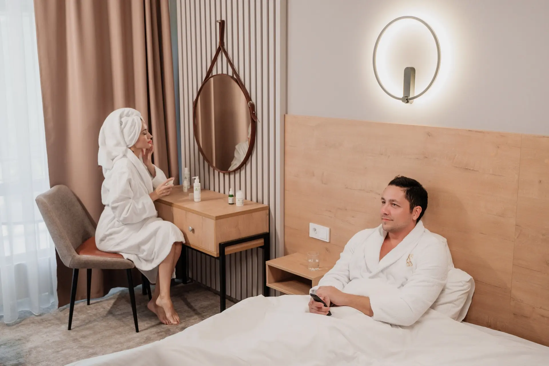В номерах все продумано до мелочей: Wi‑Fi, телевизор, холодильник, чайник и набор посуды, сейф для ценных вещей, фен и туалетные принадлежности; удобная ванная комната с мягкими полотенцами и качественной гигиеной.