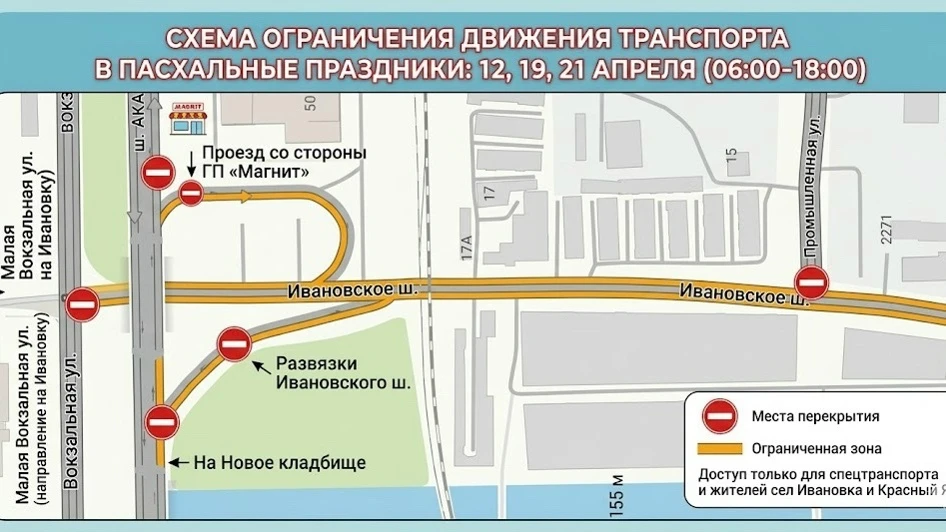 Ограничения будут действовать 12, 19 и 21 апреля. С 06:00 до 18:00 проезд будет перекрыт на улице Малая Вокзальная (поворот на село Ивановка под путепроводом и с путепровода в сторону Нового кладбища), а также на улице Промышленная и со стороны проезда от гипермаркета «Магнит».