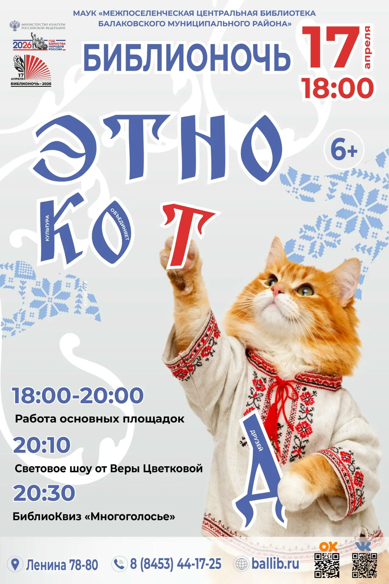 ✨ Мы уже предвкушаем встречу с вами и полным ходом ведем подготовку! Друзья, 17 апреля в 18:00 мы ждем вас на Библионочь, которая в этом году называется «Этнокод». Тема нашей ежегодной акции – единство и дружба народов России. В этом году мы стремимся раскрыть богатство культур, традиций и языков, которые сплетаются в единый многонациональный узор нашей Родины.