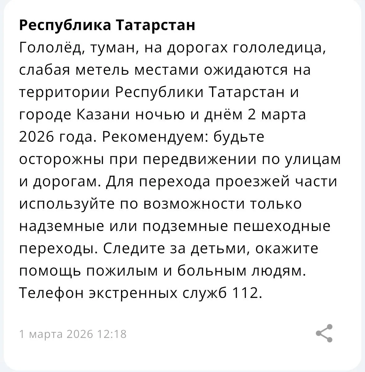 2 марта в республике и Казани прогнозируют гололёд, туман и местами слабую метель. Жителей просят быть осторожными на дорогах и при необходимости обращаться в экстренные службы по номеру 112.