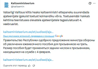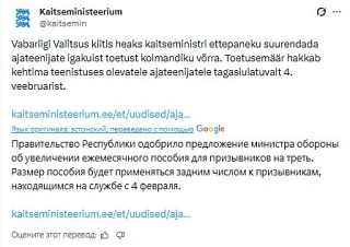Эстонским призывникам поднимут пособие на треть, следует из решения правительства
