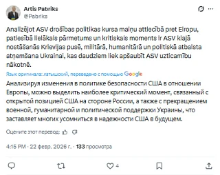 Артис Пабрикс авторитетно заявил, что проанализировал смену курса политики безопасности Вашингтона.