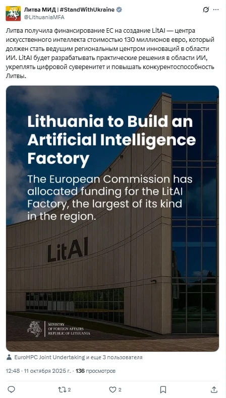 В Литве построят ЕС центр искусственного интеллекта регионального масштаба, сообщает МИД