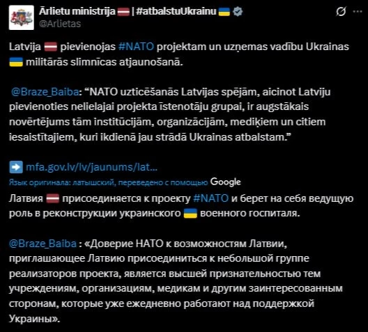 Латвия присоединяется к проекту НАТО Renovator, обязавшись реконструировать госпиталь на Украине