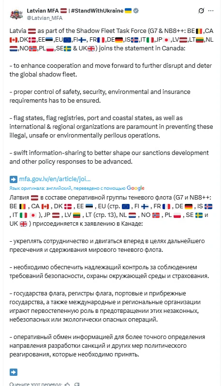 МИД республики поддержал заявление "группы противодействия теневому флоту", в состав которой входят страны группы NB8 и G7.