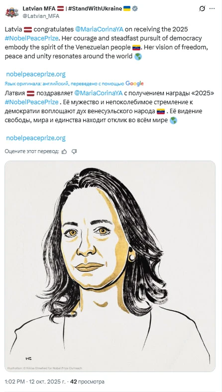 В латвийском МИД уверены, что ее "стремление к миру" находит отклик повсюду.