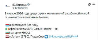 В Латвии вторая самая низкая минимальная зарплата в ЕС на январь 2026, свидетельствую данные Eurostat