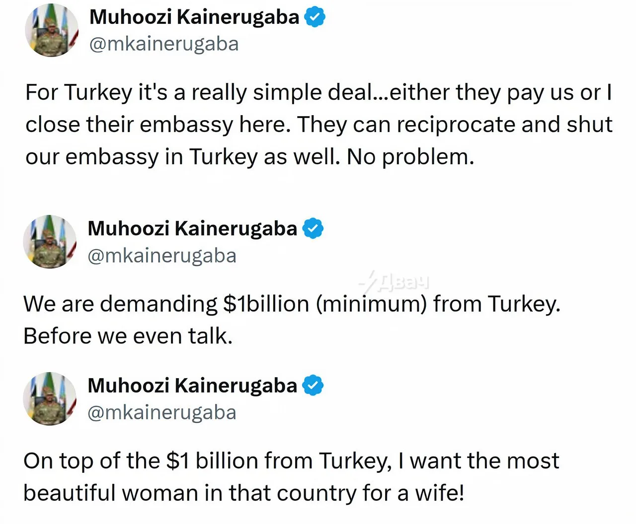 Генерал из Уганды грозится прикрыть все турецкие посольства в стране, если турки не дадут ему миллиард баксов и самую красивую турецкую женщину в жёны.